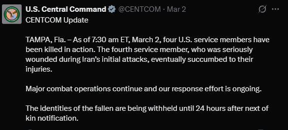 “As of 4 pm ET, March 2, six US service members have been killed in action. US forces recently recovered the remains of two previously unaccounted for service members from a facility struck during initial attacks,” CENTCOM said.
